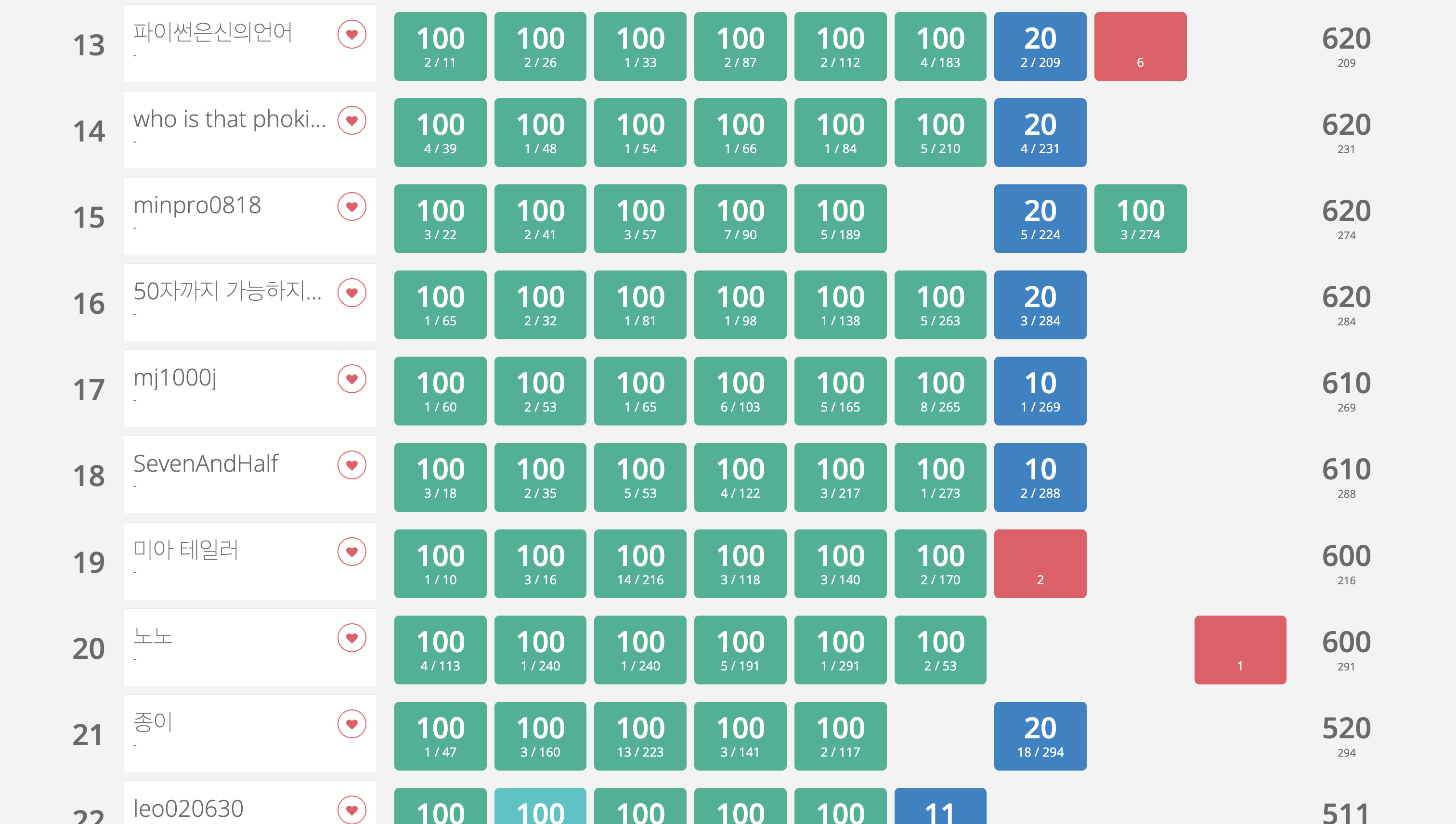 아무리 패널티 없는 대회라지만 틀린 제출 횟수가 너무 많았던 것 같다. 팀으로 나가는 대회는 대부분 패널티가 있기 때문에 구현의 정확도를 늘리는 연습이 필요할 것 같다.